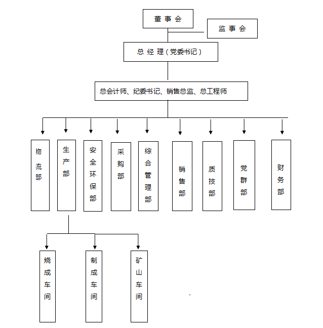 三門峽騰躍同力水泥有限公司位于河南省澠池縣境內(nèi),地處晉、陜、豫三省交匯處,緊靠連霍高速公路、310國道,314省道交通便利。公司總面積274175.46m2,公司類型為一人有限責(zé)任公司。公司實行董事會領(lǐng)導(dǎo)下的總經(jīng)理負責(zé)制,下設(shè)綜合管理部、生產(chǎn)部、財務(wù)部、采購部、市場部、銷售部、物流部、質(zhì)量技術(shù)部、安全環(huán)保部、黨群部。生產(chǎn)部下設(shè)燒成車間、制成車間、礦山車間。